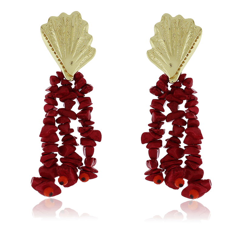 Brinco Algas Trabalhadas Pedras Corais Vermelho