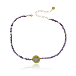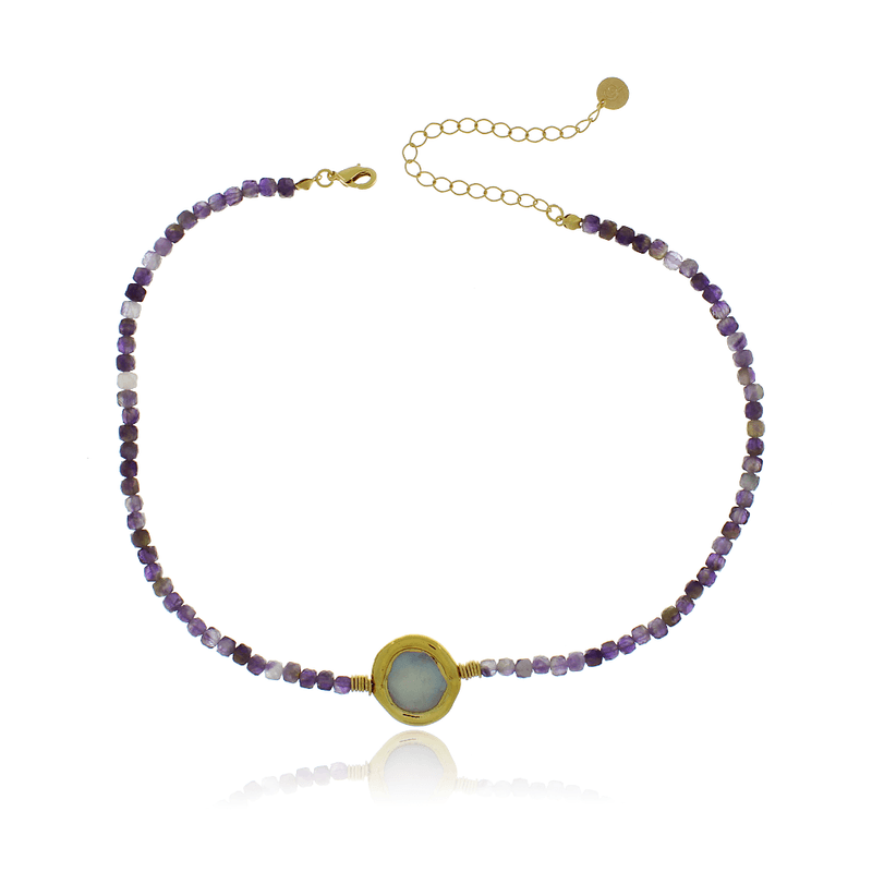 Colar Quadradinho Pedra Ametista Pérola Volta Lisa Rondelas